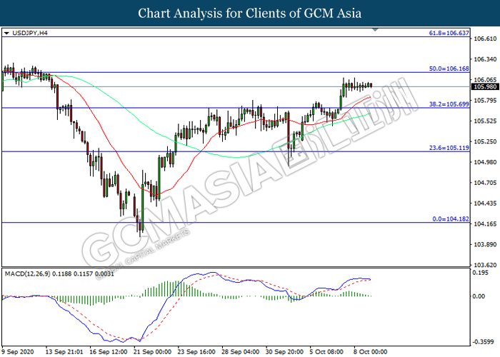 USDJPY, H4: USDJPY was traded higher while currently near the resistance level at 106.15. However, MACD which illustrated diminishing bullish momentum suggest the pair to be traded lower in short-term as technical correction.