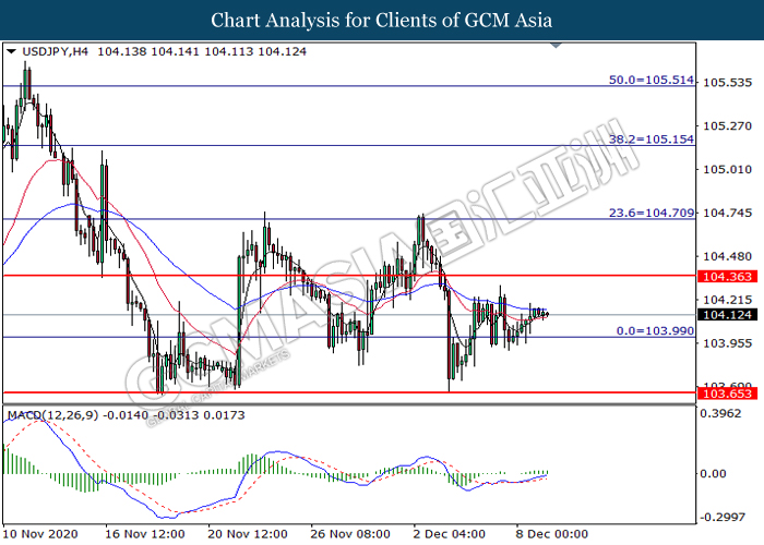 USDJPY, H1: USDJPY was traded higher following prior rebound from the support level at 104.00. MACD which illustrate bullish bias momentum suggest the pair to extend its gains toward the resistance level at 104.35.