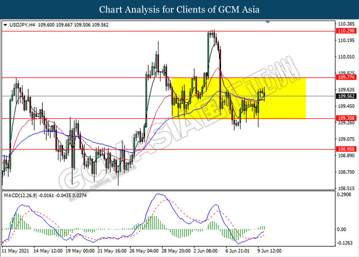 USDJPY, H4: USDJPY remain traded in a sideway channel following recent rebound from the support level 109.30. However, MACD which illustrate bullish momentum signal with the formation of golden cross suggest the pair to be traded higher towards the resistance level 109.75.