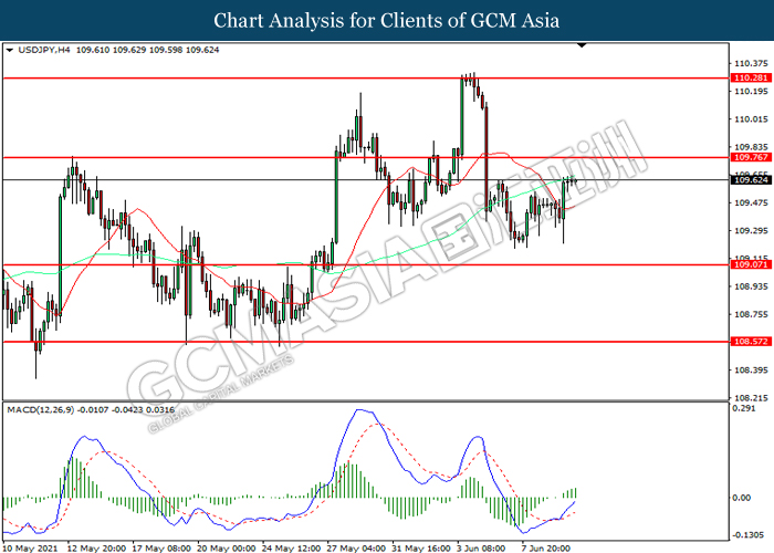 USDJPY, H4: USDJPY was traded higher while currently near the resistance level at 109.75. MACD which illustrated increasing bullish momentum suggest the pair to extend its gains after it successfully breakout above the resistance level.