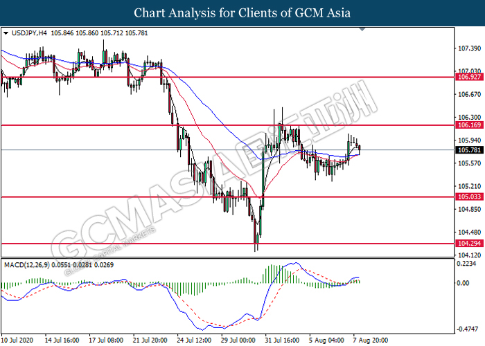 USDJPY, H4: USDJPY was traded lower following prior retracement near the resistance level at 106.15. MACD which illustrate diminishing bullish momentum signal suggest the pair to extend its losses toward the support level at 105.05.