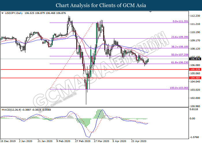 USDJPY, Daily: USDJPY was traded higher following prior rebound from the support level at 106.25. MACD which illustrate diminishing bearish momentum signal suggest the pair to extend its gains toward the resistance level at 107.20.