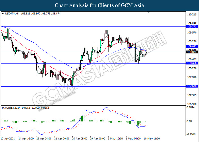 USDJPY, H4: USDJPY was traded higher while currently testing near the resistance level 109.05. MACD which illustrate diminishing bearish momentum signal with the starting formation of golden cross suggest the pair to extend its gains after it breaks above the level.