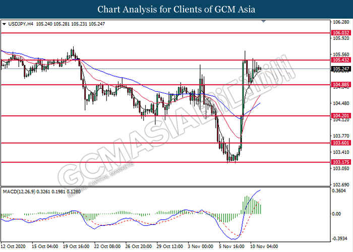 USDJPY, H4: USDJPY was traded lower following prior retracement from the resistance level at 105.45. MACD which illustrate diminishing bullish momentum suggest the pair to extend its losses toward the support level at 104.90.