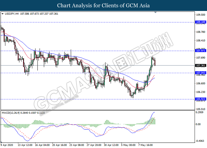 USDJPY, H4: USDJPY was traded lower following prior retracement from its high level. MACD which illustrate diminishing bullish momentum signal suggest the pair to extend its retracement towards the support level 107.05.