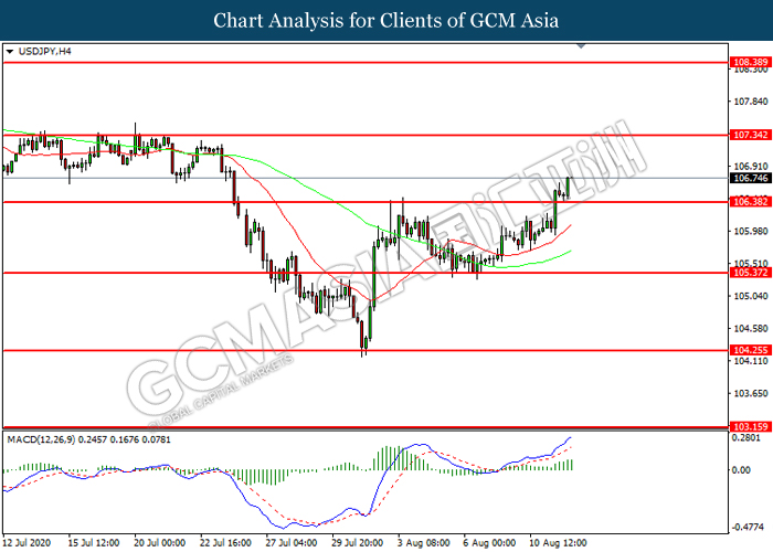 USDJPY, H4: USDJPY was traded higher following prior breakout above the previous resistance level at 106.40. MACD which illustrated increasing bullish momentum suggest the pair to extend its gains toward resistance level at 107.35.