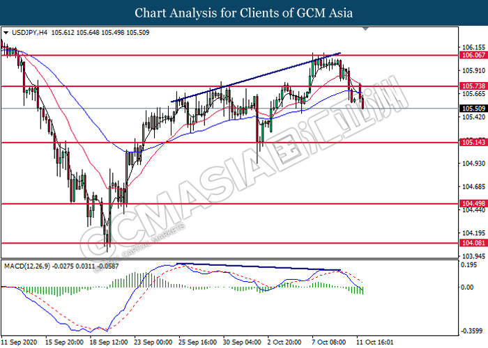 USDJPY, H4: USDJPY was traded lower following prior retracement from the resistance level at 105.75. MACD which illustrate diminishing bearish momentum signal suggest the pair to extend its losses toward the support level at 105.15.