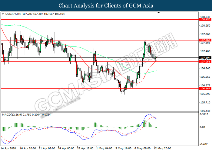 USDJPY, H4: USDJPY was traded lower while currently testing the support level at 107.05. MACD which illustrated increasing bearish momentum suggest the pair to extend its losses after it successfully breakout below the support level.