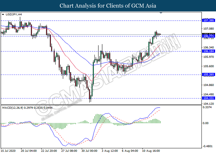 USDJPY, H4: USDJPY was traded flat while currently testing the support level 106.75. However, MACD which illustrate bearish bias signal suggest the pair to be traded lower after it breaks below the support level.