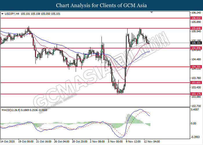 USDJPY, H4: USDJPY was traded lower following prior retracement from the resistance level at 105.65. MACD which illustrate increasing of bearish momentum suggest the pair to extend its losses toward the support level at 104.90.