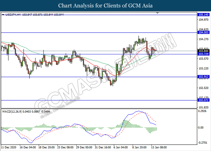 USDJPY, H4: USDJPY was traded higher following recent rebound from the support level 103.70. MACD which illustrate diminishing bearish momentum signal suggest the pair to extend its rebound towards the resistance level 104.50.