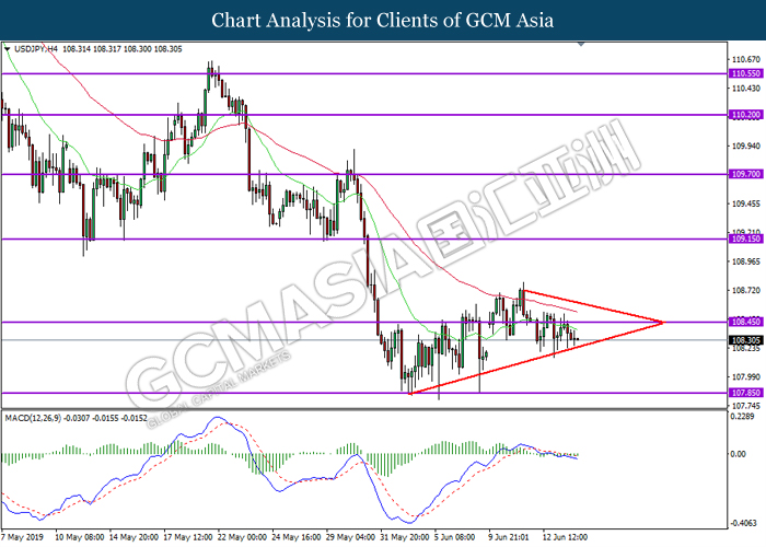 USDJPY, H4: USDJPY remained traded in a narrowing triangle while currently testing the bottom level of the triangle. MACD which illustrate persistent bearish momentum suggest the pair to extend its losses after successfully breaking below the bottom level of the triangle.