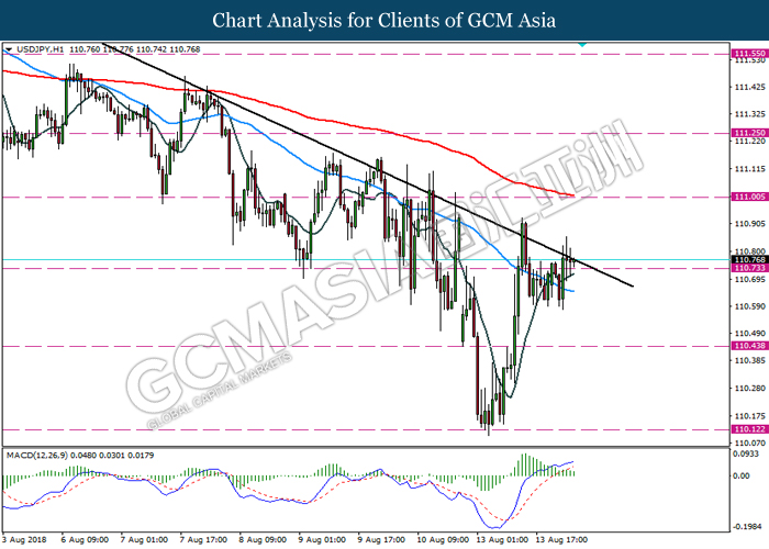USDJPY, H1: USDJPY was traded higher while currently testing the resistance level 110.75 and descending trend line. Although MACD which display ongoing bullish momentum, a breakout above the resistance level 110.75 and trend line is required for further confirmation.