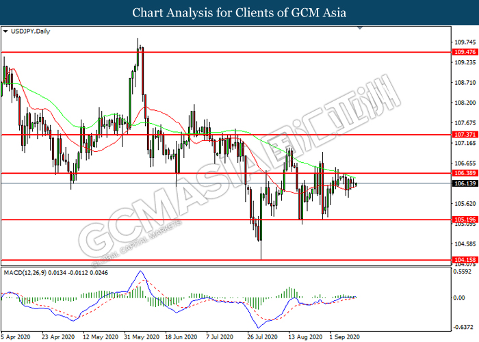 USDJPY, Daily : USDJPY was traded higher while currently testing the resistance level at 106.40. However, MACD which illustrated diminishing bullish momentum suggest the pair to be traded lower in short-term as technical correction.