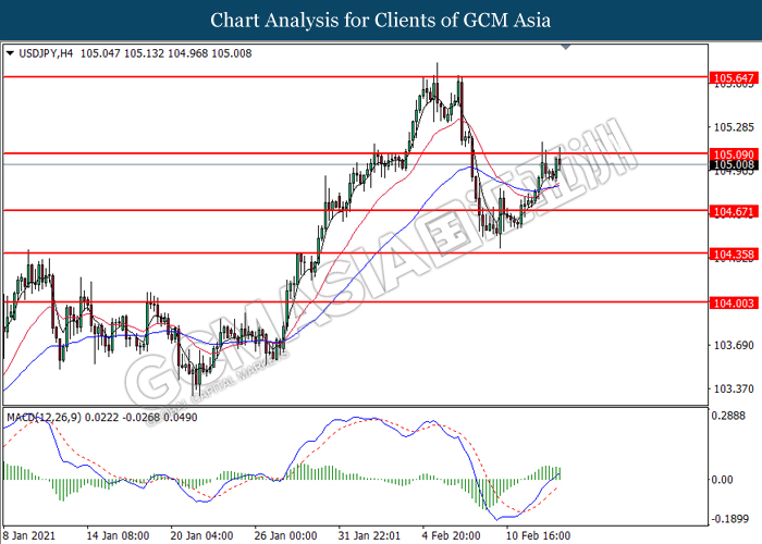 USDJPY, H4: USDJPY was traded higher while currently testing the resistance level at 105.10. However, MACD which illustrated diminishing bullish momentum signal suggest the pair to undergo technical correction in short term toward the support level at 104.65.