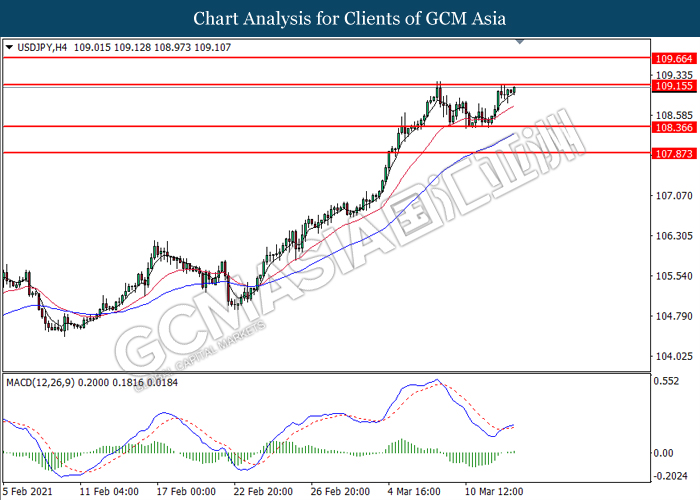 USDJPY, H4: USDJPY was traded higher while currently testing the resistance level at 119.15. MACD which illustrated bullish bias momentum signal suggest the pair to extend its gains after it successfully breakout above the resistance level at 109.15.