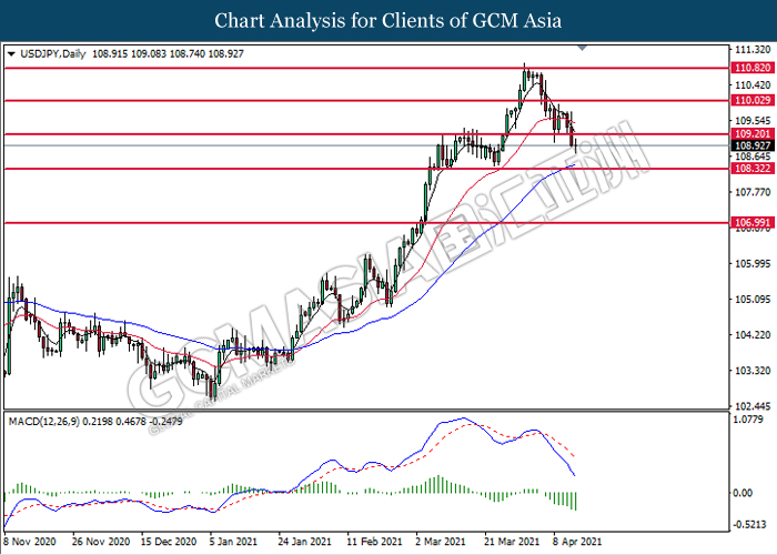 USDJPY, H4: USDJPY was traded lower following prior breakout below the previous support level at 109.20. MACD which illustrated bearish bias momentum signal suggest the pair to extend its losses toward the support level at 108.30.
