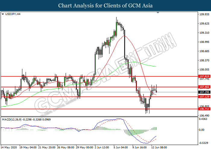 USDJPY, H4: USDJPY was traded higher while currently testing the resistance level at 107.45. MACD which illustrated increasing bullish momentum suggest the pair to extend its gains after it successfully breakout above the resistance level.