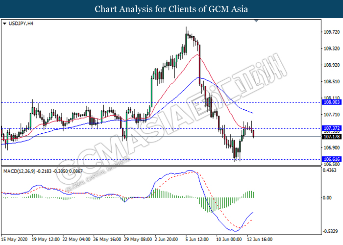 USDJPY, H4: USDJPY was traded lower following prior retracement from the resistance level 107.35. MACD which illustrate diminishing bullish bias signal suggest the pair to extend its retracement towards the support level 106.60.