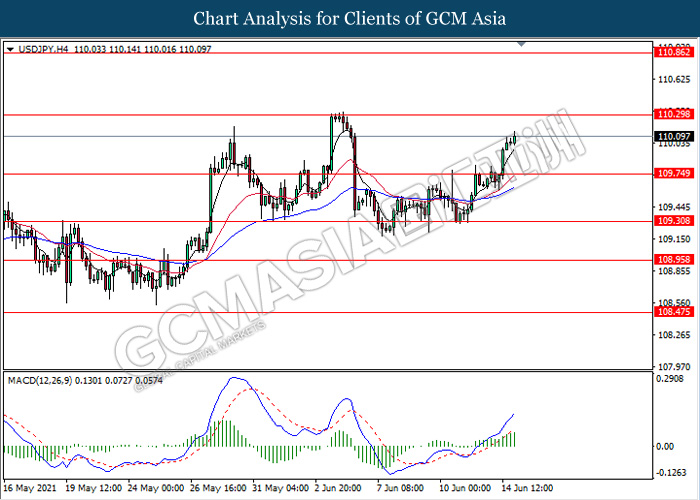 USDJPY, H4: USDJPY was traded higher following recent breakout above the previous resistance level 109.75. MACD which illustrate bullish momentum signal suggest the pair to extend its gains towards the resistance level 110.30.