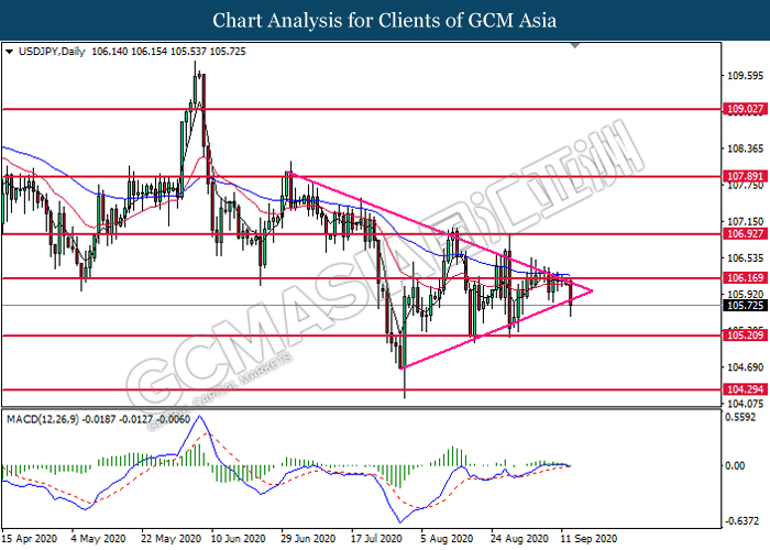 USDJPY, Daily: USDJPY was traded lower while currently testing the bottom level of the triangle. MACD which illustrates diminishing bullish momentum suggest the pair to extend its losses after it successfully breakout below the triangle’s bottom level.