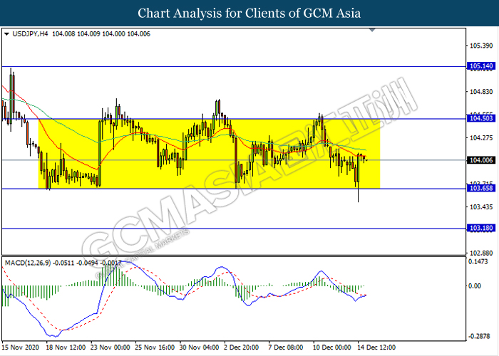 USDJPY, H4: USDJPY remain traded in a sideway channel following recent rebound from the support level 103.65. However, MACD which illustrate diminishing bearish momentum signal with the formation of golden cross suggest the pair to extend its rebound in short term towards the resistance level 104.50.