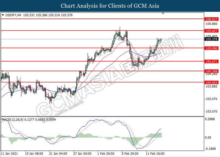 USDJPY, H4: USDJPY was traded higher following prior breakout above the previous resistance level at 105.10. MACD which illustrated bullish bias momentum signal suggest the pair to extend its gains toward the resistance level at 105.65.