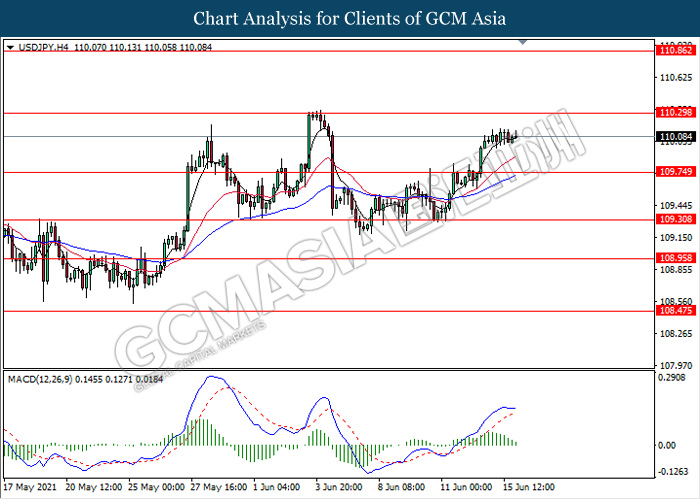 USDJPY, H4: USDJPY was traded flat after recent breakout above the previous resistance level 109.75. However, MACD which illustrate diminishing bullish momentum signal suggest the pair to be traded lower in short term towards the support level 109.75.
