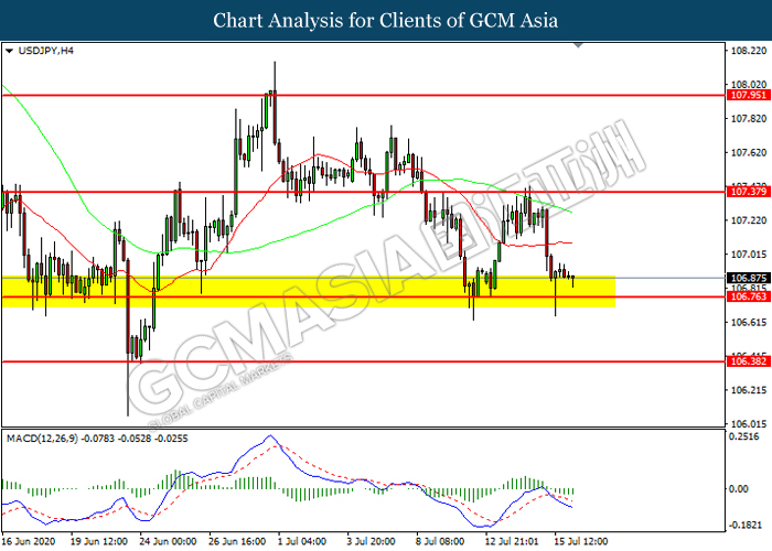 USDJPY, H4: USDJPY was traded lower while currently near the support level at 106.75. MACD which illustrated increasing bearish momentum suggest the pair to extend its losses after it successfully breakout below the support level.