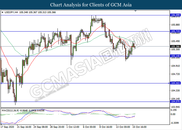USDJPY, H4: USDJPY was traded higher following prior rebound from the support level 105.15. MACD which illustrate bullish momentum signal with the recent formation of golden cross suggest the pair to extend its rebound towards the resistance level 105.70.