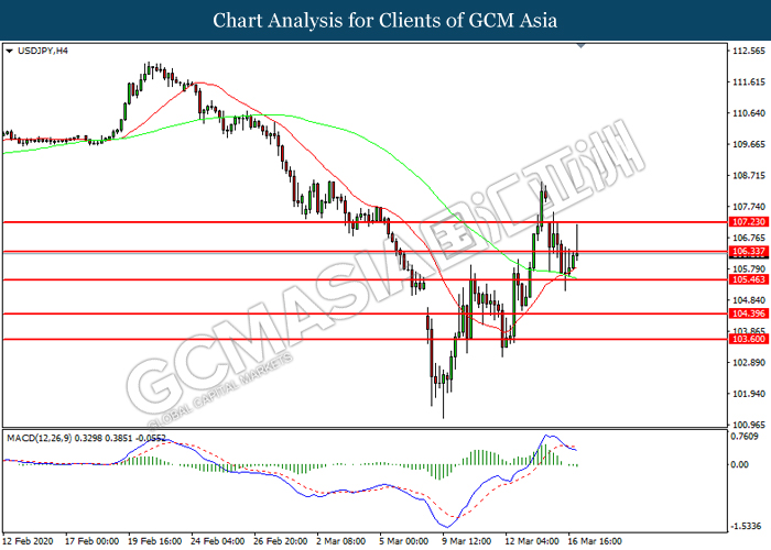 USDJPY, H4: USDJPY was traded higher while currently testing the resistance level at 106.35. However, MACD which illustrated increasing bearish momentum suggest the pair to be traded lower in short-term as technical correction.