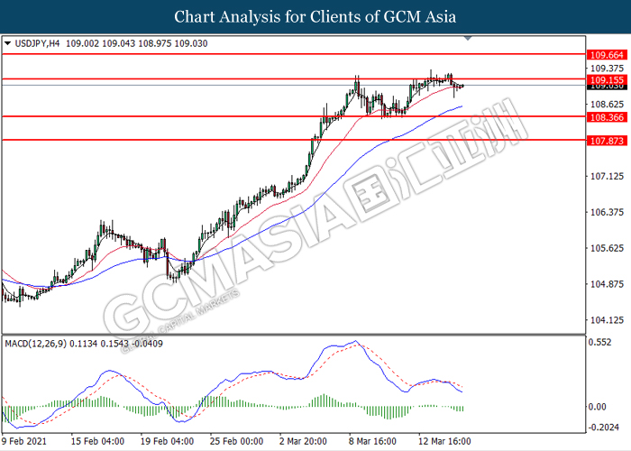 USDJPY, H4: USDJPY was traded lower following prior retracement from the resistance level at 109.15. MACD which illustrated bearish bias momentum signal suggest the pair to extend its losses toward the lower level.