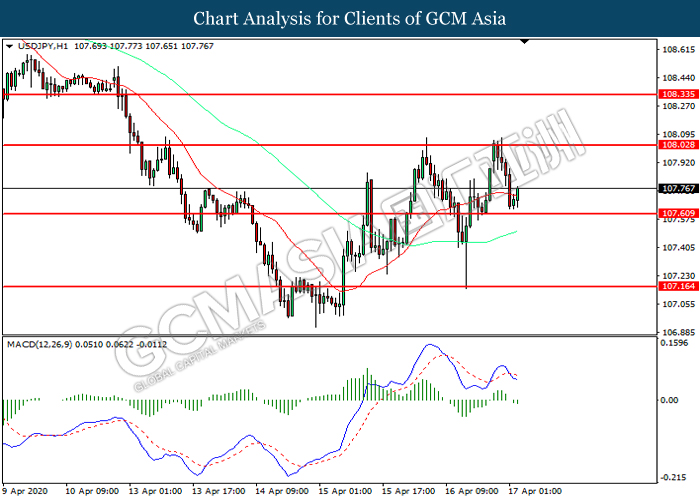 USDJPY, H1: USDJPY was traded higher following prior rebound from the support level at 107.60. However, MACD which illustrated increasing bearish momentum suggest the pair to be traded lower in short-term as technical correction.