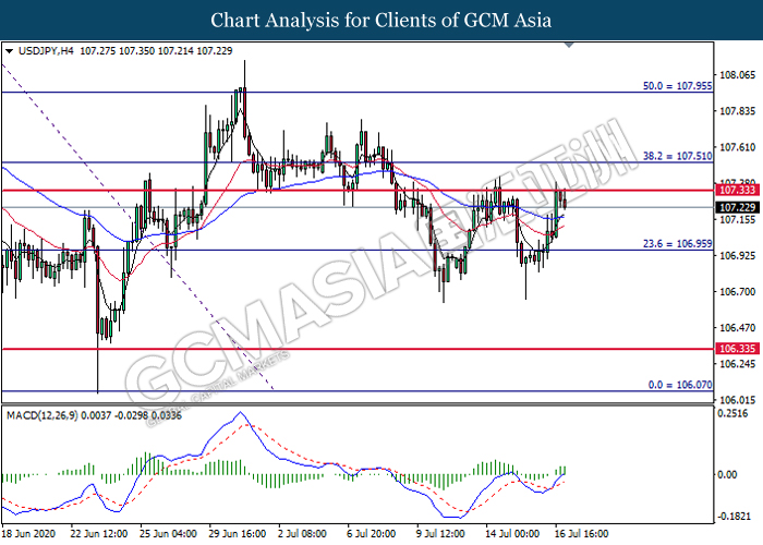 USDJPY, H4: USDJPY was traded lower following prior retracement from the resistance level at 107.35. MACD which illustrate diminishing bullish momentum signal suggest the pair to extend its losses toward the support level at 106.95.