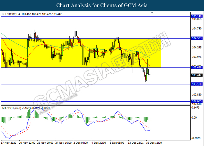USDJPY, H4: USDJPY was traded lower following prior retracement from the resistance level 103.65. MACD which illustrate bearish bias signal suggest the pair to be traded lower towards the support level 103.20