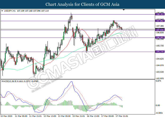 USDJPY, H1: USDJPY was traded lower while currently testing the support level at 107.05. MACD which illustrated increasing bearish momentum suggest the pair to extend its losses after it successfully breakout below the support level.