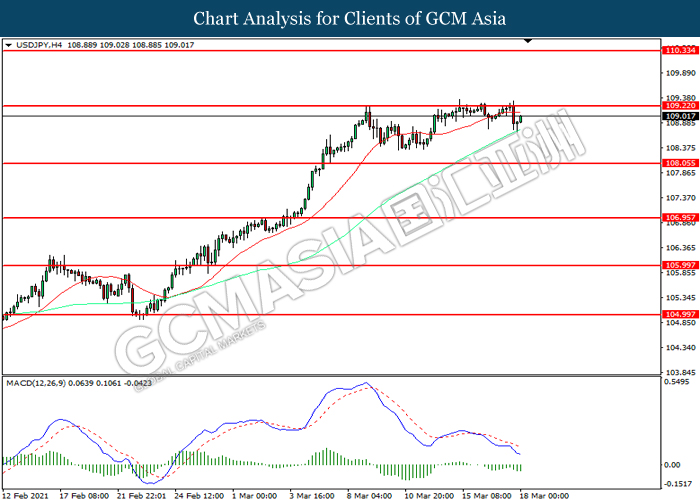 USDJPY, H4: USDJPY was traded higher while currently testing the resistance level at 109.20. However, MACD which illustrated increasing bearish momentum suggest the pair to be traded lower in short-term as technical correction.