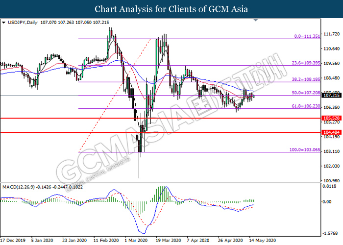 USDJPY, Daily: USDJPY was traded lower following prior retracement near the resistance level at 107.20. MACD which illustrate diminishing bullish momentum signal suggest the pair to extend its losses toward the support level at 106.25.
