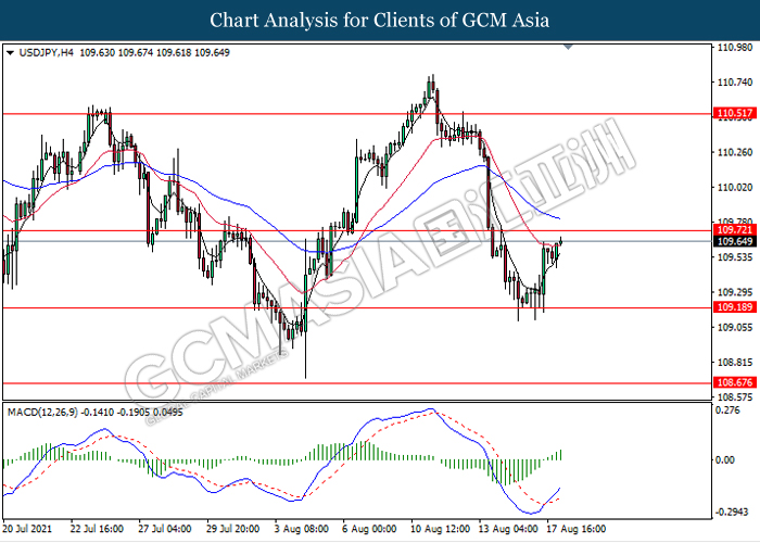 USDJPY, H4: USDJPY was traded higher while currently testing near the resistance level 109.70. MACD which illustrate bullish bias signal with the formation of golden cross suggest the pair to extend its gains after it breaks above the resistance level.