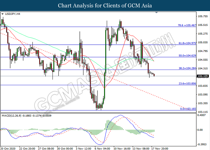 USDJPY, H4: USDJPY was traded lower following prior breakout below the previous support level at 104.30. However, MACD which illustrated diminishing bearish momentum suggest the pair to be traded higher in short-term as technical correction.