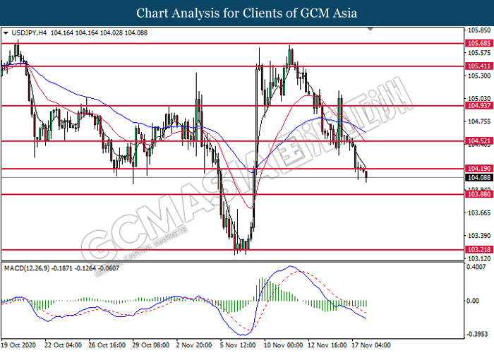 USDJPY, H4: USDJPY was traded lower following prior breakout below the previous support level at 104.20. MACD which illustrate bearish bias momentum suggest the pair to extend its losses toward the support level at 103.90.