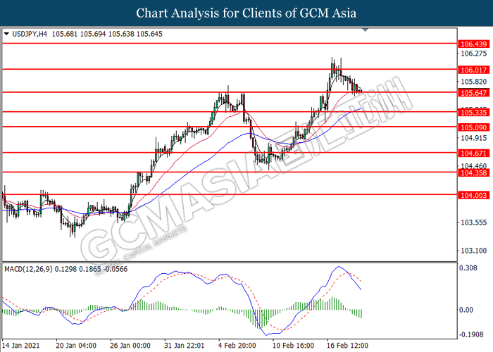 USDJPY, H4: USDJPY was traded lower while currently testing the support level at 105.65. MACD which illustrated bearish bias momentum signal suggest the pair to extend its losses after it successfully breakout below the support level.