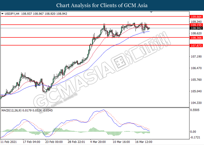 USDJPY, H4: USDJPY was traded lower following prior retracement from the resistance level at 109.15. MACD which illustrated bearish bias momentum signal suggest the pair to extend its losses toward the lower level.