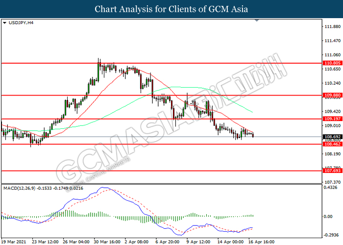 USDJPY, H4: USDJPY was traded lower while currently near the support level at 108.45. MACD which illustrated diminishing bullish momentum suggest the pair to extend its losses after it successfully breakout below the support level.