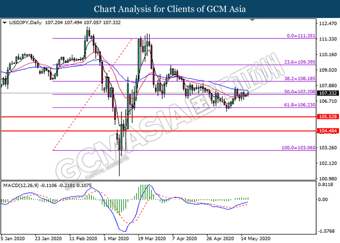 USDJPY, Daily: USDJPY was traded higher following prior breakout above the previous resistance level at 107.20. MACD which illustrate bullish bias momentum signal suggest the pair to extend its gains toward the resistance level at 108.20.