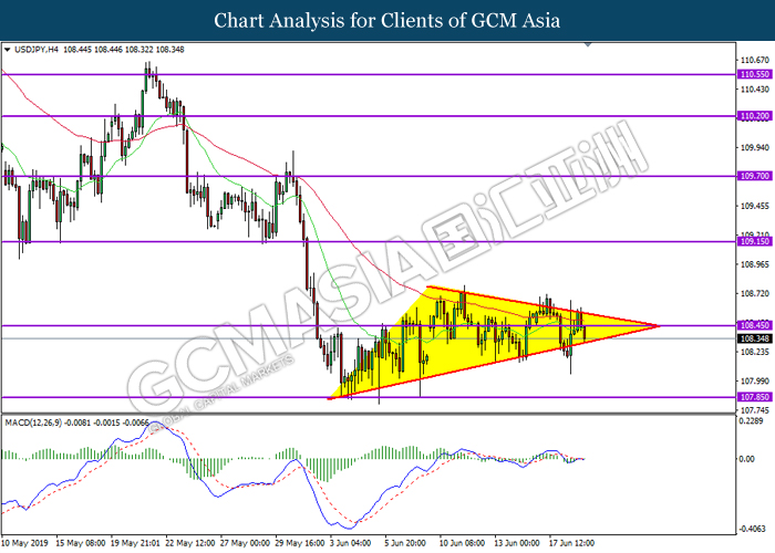 USDJPY, H4: USDJPY remains traded in a narrowing triangle while currently testing near the bottom-level of the triangle. MACD which illustrate bearish bias signal suggest the pair to extend its losses after breaking below the bottom level of the triangle.