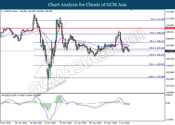USDJPY, Daily: USDJPY was traded lower following prior breakout below the previous support level at 107.15. MACD which illustrate bearish bias momentum signal suggest the pair to extend its losses toward the support level at 106.20.