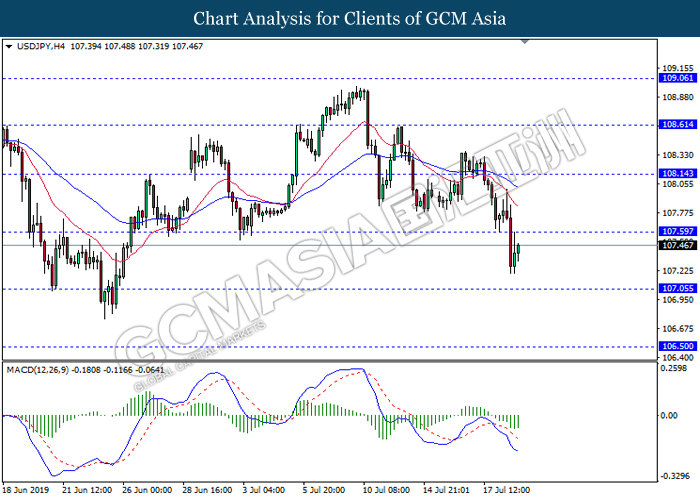 USDJPY, H4: USDJPY was traded lower following prior rebound from its low levels. MACD which illustrate diminishing bearish momentum signal suggest the pair to extend its rebound in short term towards the resistance level 107.60.