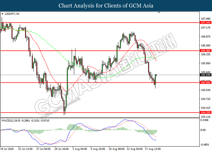 USDJPY, H4: USDJPY was traded higher following prior rebound from the support level at 105.30. MACD which illustrated diminishing bearish momentum suggest the pair to extend its gains toward resistance level at 106.40.