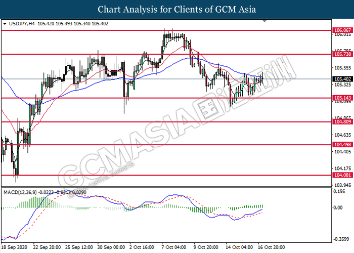 USDJPY, H4: USDJPY was traded higher following prior rebound from the support level at 105.15. MACD which illustrate bullish bias momentum suggest the pair to extend its gains toward the resistance level at 105.75.